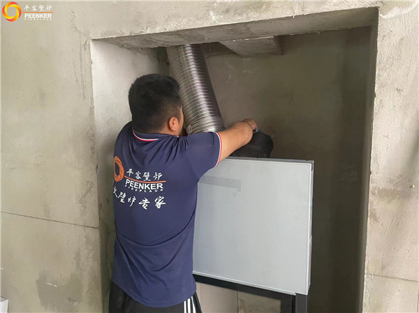 項目介紹:提香別墅項目現場有磚石爐膛和煙道,所以業主選擇嵌入式壁爐丹麥Morso S101-12,這是一款提拉式爐門的壁爐,煙囪使用英國Schiedel柔性煙管,中間無接縫,平客壁爐項目部帶隊上門安裝!